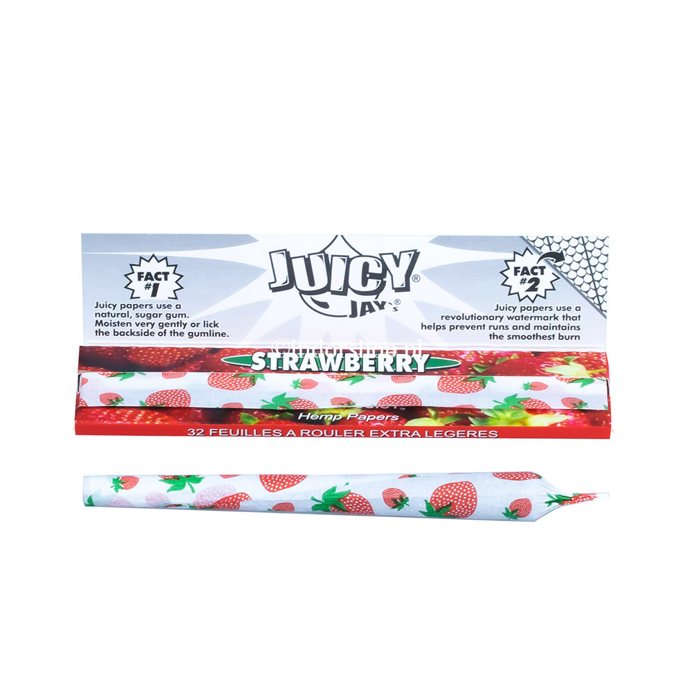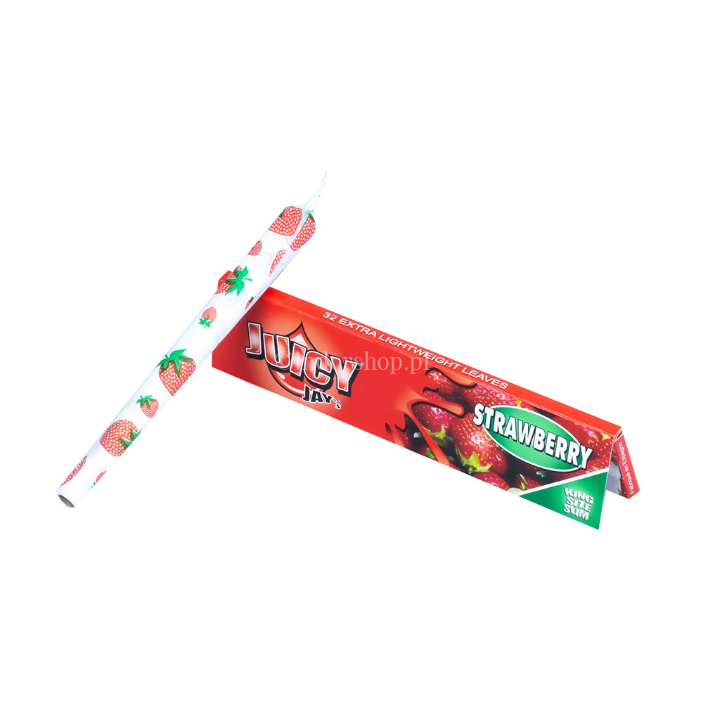 Truskawkowe bletki Juicy Jay’s są wykonane z papieru konopnego, a na całej długości `bletki nadrukowano specjalny znak wodny w kształcie plastra miodu, spowalniający i wyrównujący ich spalanie. Mają słodki, intensywny smak i aby go chronić, każde opakowanie jest starannie ofoliowane. Nadruk w kształcie truskawek, dodający koloru każdej bletce, wykonany jest atramentem sojowym. Opakowanie zawiera trzydzieści dwie bletki, w których użyto naturalnego, roślinnego kleju.