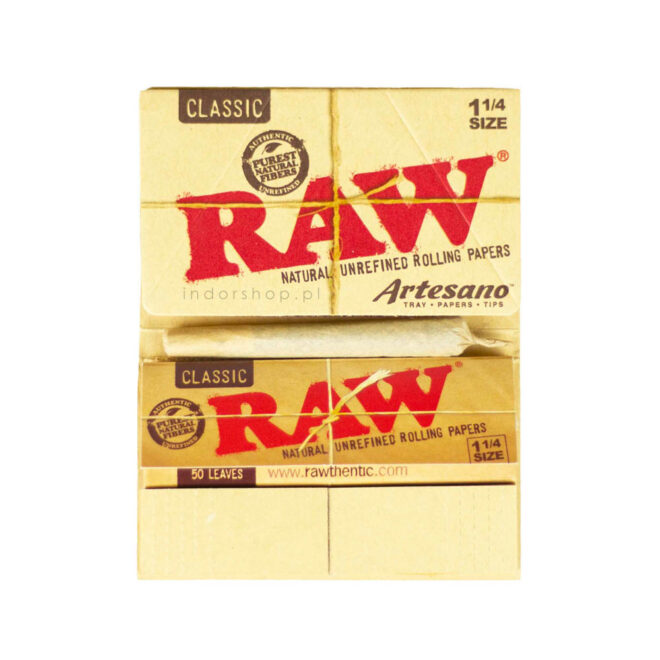 Krótkie, brązowe bletki Raw. Dzięki specjalnemu znakowi wodnemu w kształcie plastra miodu palą się równo i powoli. Opakowanie zawiera sto sztuk bletek.