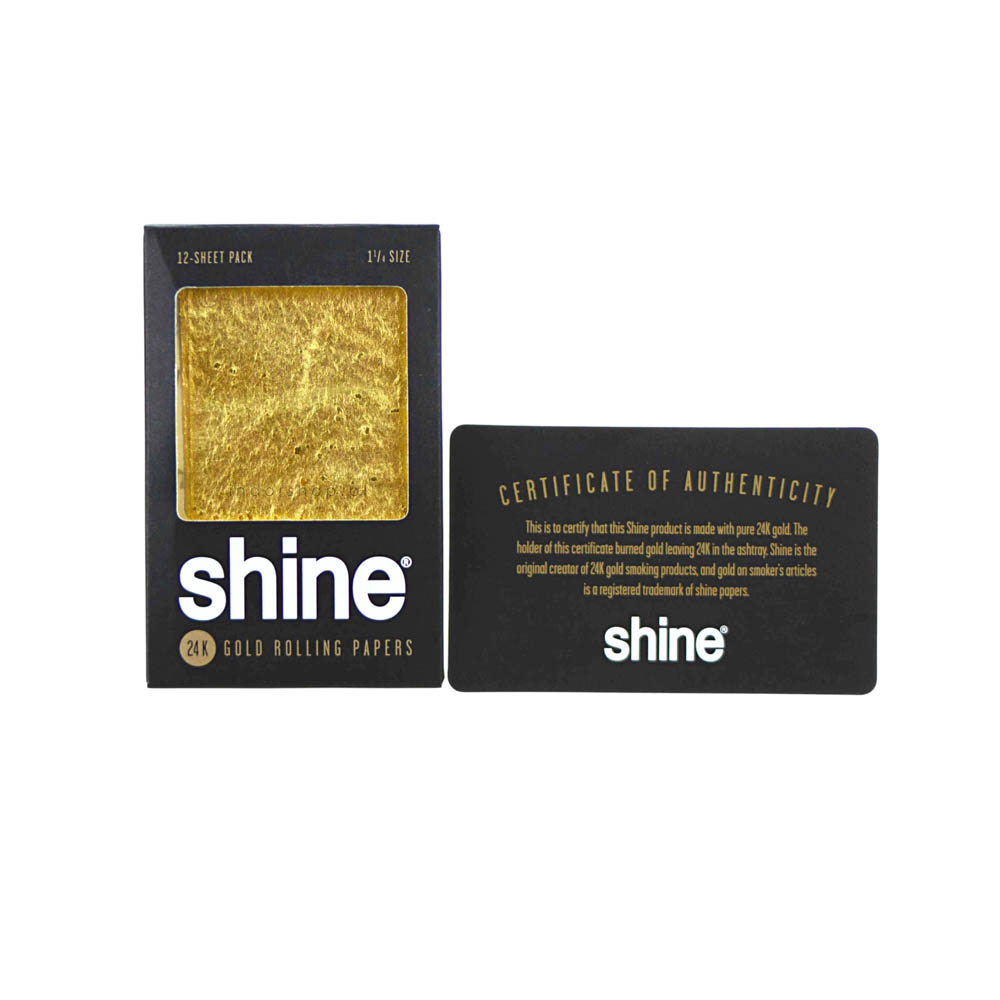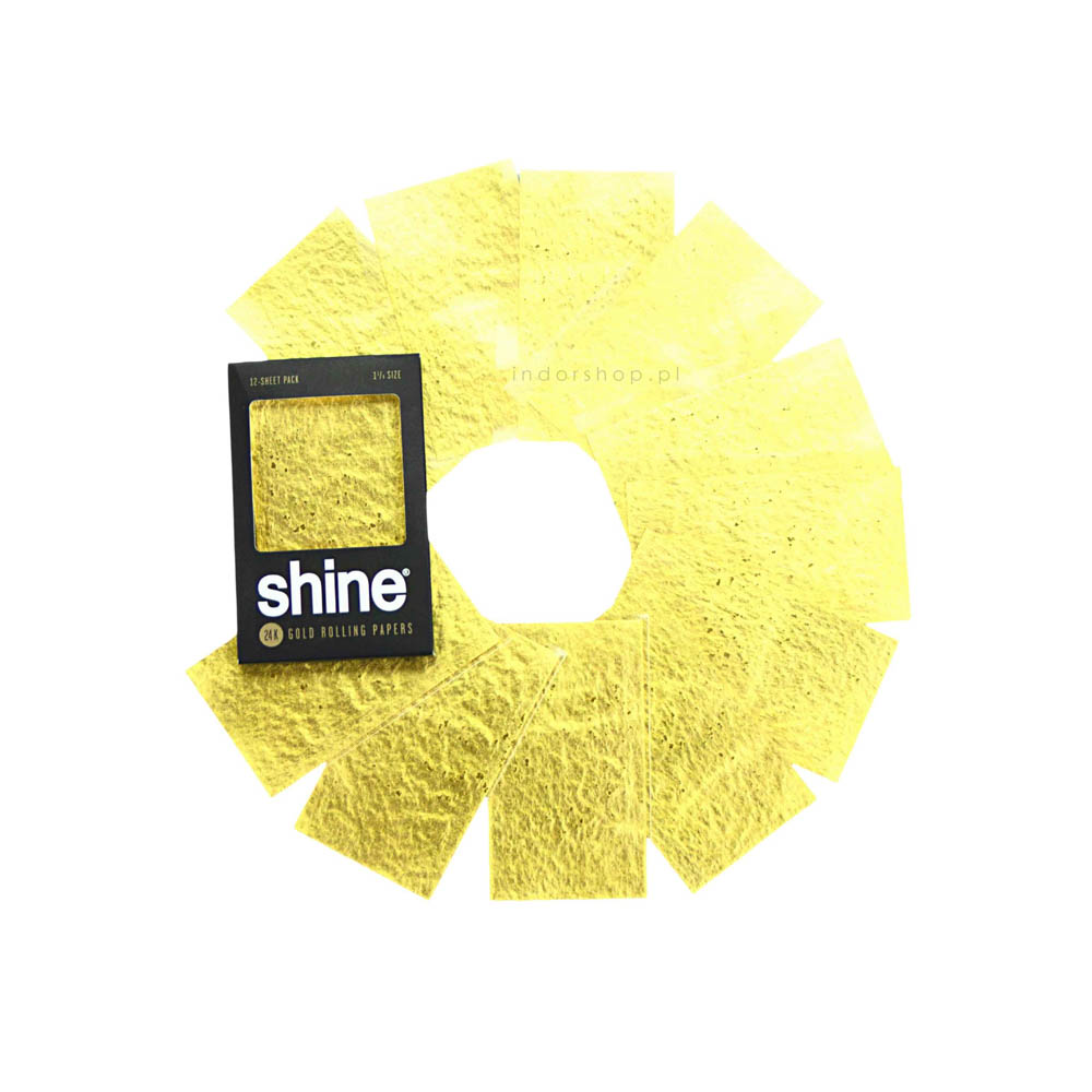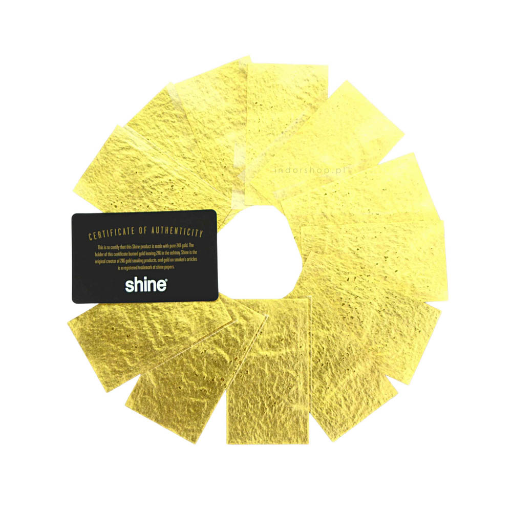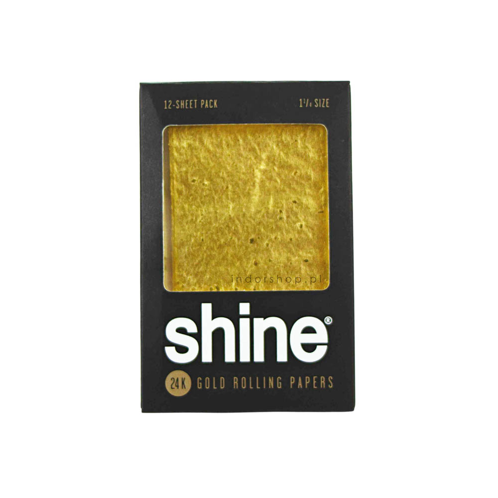 Bibułki firmy Shine w rozmiarze 1 1/4, wykonane z papieru konopnego pokrytego 24-karatowym złotem. Opakowanie zbiorcze zawierające 12 ekskluzywnych bletek. Idealne dl osób ceniących sobie prestiż i oryginalność.