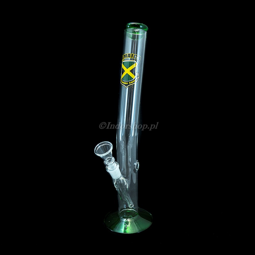 Szklane bongo Jamaica jest średniej wielkości – ma wysokość 32cm, a dzięki odchylonemu w tył ustnikowi wygodnie się go używa. Prosty dzban ma średnicę 34mm, a nieco szersza podstawa zapewnia całości stabilność. Szlif 14,5mm.