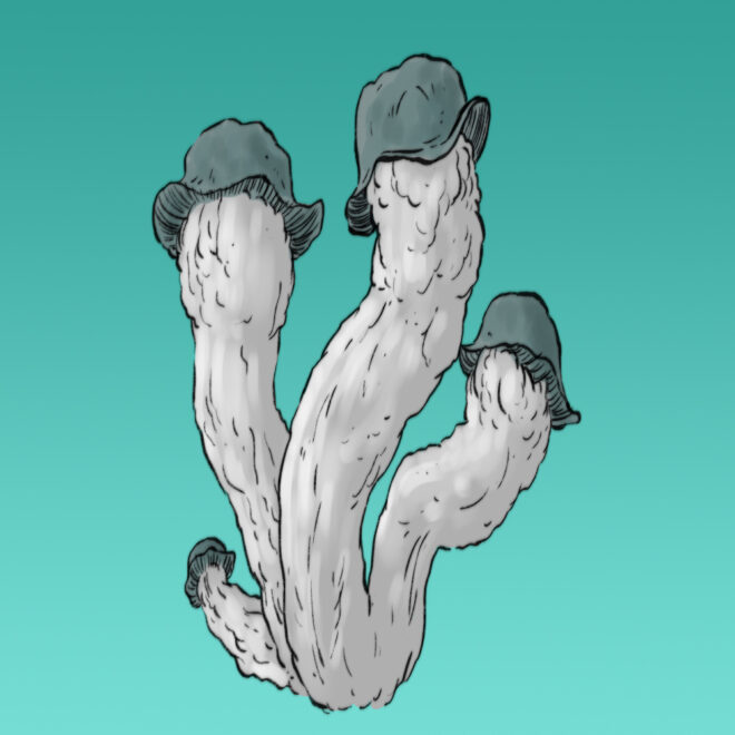 A jakie produkuje owocniki? Spektakularne. Powykręcana srebrzysto szara noga z niebieskawym kapelutkiem. Grzybowe dzieła sztuki, które mogły by ozdobić nawy psychodelicznej kaplicy. Taki jest Nutcracker.