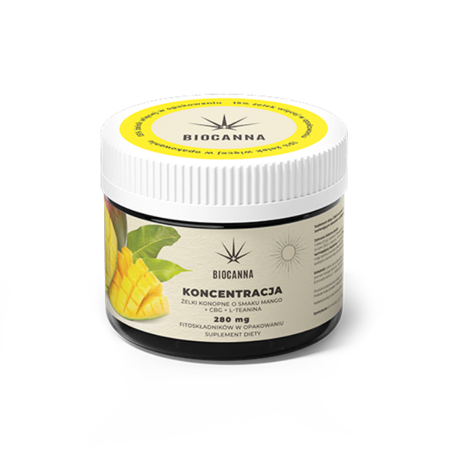 Skoncentruj się z naturą! Poznaj żelki konopne Biocanna Koncentracja o intensywnym, tropikalnym smaku mango. To funkcjonalna przekąska stworzona specjalnie dla osób dorosłych, które szukają naturalnego wsparcia dla skupienia, koncentracji i codziennej wydajności umysłowej. Każdy żelek zawiera aż 10 mg naturalnych fitoskładników z oleju z konopi siewnej (w tym CBG) oraz 100 mg L-teaniny – naturalnego związku znanego z działania wspierającego jasność umysłu i redukcję napięcia psychicznego.